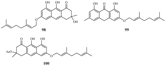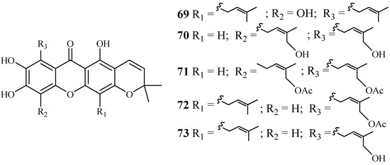 Phytochemical separation of the concentrated acetone extract of the dried leaves and branches of Garcinia mckeaniana has led to the identification of three new xanthones, mckeanianones A-C (69–71), and two known ones, bannaxanthones I (73) and E (73) (Figure 11). These compounds all contain two isoprene units. They were evaluated for their activity against the TM4 and K1 strains of P. falciparum with IC50 values in the range of of 6.0–8.5 and 3.6–7.3 µM, respectively, and compounds 70, 71 and 73 showed cytotoxicity against Vero cells with the IC50 values in the range of 12.6–29.5 µM [42].