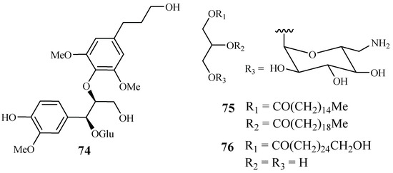 From the work of He et al. [26], bioassay-guided separation of the chloroform extract of the stems of Rourea minor (Gaertn.) Aubl. led to the identification of three active compounds including two new neolignan glycosides, rourinoside (74) and rouremin (75), and the known 1-(26-hydroxyhexacosanoyl)-glycerol (76) (Figure 12). The three compounds showed weak to moderate in vitro activities against the D6 and W2 clones of P. falciparum. Compound 74 demonstrated IC50 values at 3.7 (D6) and 2.1 (W2) µM; 75 at IC50 values of 5.1 (D6) and 4.5 (W2) µM, and 76 at IC50 values of 9.5 (D6) and 12.7 (W2) µM. These compounds exhibited no cytotoxicity against KB cells at 20 µg/mL.