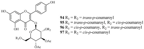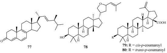 In vitro IC50 values against the P. falciparum D10 strain were determined for ergosta-4,6,8,22-tetraene-3-one (77) (61.0 µM), 3-epideoxyflindissol (78) (128.0 µM), 3β-O-cis-coumaroyl betulinic acid (79) (10.4 µM) and 3β-O-trans-coumaroyl betulinic acid (80) (15.3 µM) (Figure 13), which were separated from the leaves of Cornus florida L. by Graziose et al. for the first time [43].