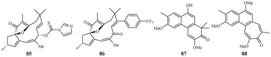 Through the screening of a natural product-based synthetic compound library, Hadi et al. [45] discovered that jatrophones (the natural products from Jatropha isabelli) possess significant antiplasmodial activity. The jatrophone diterpene derivatives 85 and 86 displayed antiplasmodial activities against strains 3D7 and K1 of P. falciparum with IC50 values of 5.7/5.9 and 6.1/5.9 μM, respectively (Figure 16). The two compounds showed low cytotoxicities against the human HepG2, RAJI, BJ and HEK293 cells with EC50 values at around 26 μM.