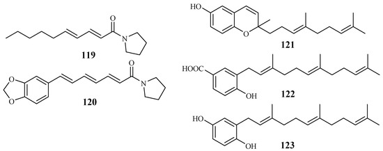 2-Isopropenyl-6-acetyl-8-methoxy-1,3-benzodioxin-4-one (19), isolated from the whole plants of the Korean folk medicine Carpesium divaricatum, was reported to show antimalarial activity [35,93] (Figure 6). The compound exhibited activity against D10 with an IC50 value of 2.3 µM.