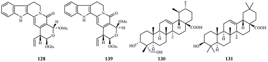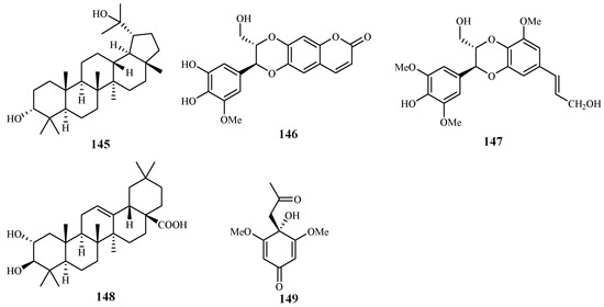 Cecropia pachystachya is a medicinal plant, which has been used in Brazil. The ethanol extracts of the different parts of the plants were evaluated for their activity against P. falciparum in vitro and P. berghei in vivo [39]. The parasitemia of malaria-infected mice was reduced by 35–66% with treatment of the ethanol extracts of the wood, root, and leaf materials in comparison with the non-treated control group. The plant root extracts were further analyzed and fractionated to provide subfractions, which were also active in an in vivo study. Two compounds, β-sitosterol (32) and tormentic acid (33), were identified from the subfractions (Figure 8). Both compounds showed plasmodial inhibitory activity. However, only tormentic acid (33) demonstrated inhibitory activity against P. falciparum chloroquine-resistant parasites (W2) (IC50 19.0–25.2 µM).
