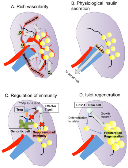 Summary of the characteristics of the spleen as a transplantation site for islets. The spleen has four advantages as a site of islet transplantation: (A) rich vascularity; (B) physiological insulin secretion; (C) regulation of immunity; and (D) potential for islet regeneration.