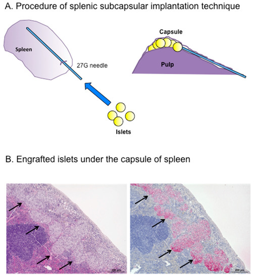 - Itoh, T.; Nishinakamura, H.; Kumano, K.; Takahashi, H.; Kodama, S. The Spleen Is an Ideal Site for Inducing Transplanted Islet Graft Expansion in Mice. PLoS ONE 2017, 12, e0170899. [Google Scholar] [CrossRef] [PubMed]