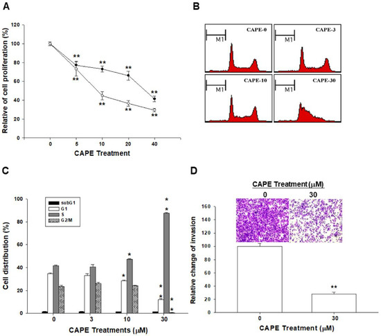 CAPE, extracted from propolis, a natural health product derived from honeybee hives, has shown many pro-healthy effects, including anti-cancer effects. Thus, CAPE has been widely studied in the field of cancer treatment [15,21,22,23]. Our previous study in OSCC indicated that CAPE (5–30 μM) treatments or CAPE (10 mg/kg/day) intraperitoneal injection significantly attenuated cancer cell growth in vitro or in xenograft animal model [14]. Regarding NPC, CAPE-related studies are still very limited. Results of our study illuminated that CAPE was able to repress NPC cell growth in a dose-dependent manner and induced cell cycle arrest at S phase (Figure 1). Since metastatic NPC leads to a very poor prognosis, the finding that CAPE could attenuate NPC cell invasion further implies the great potential of CAPE for NPC treatment (Figure 1D).