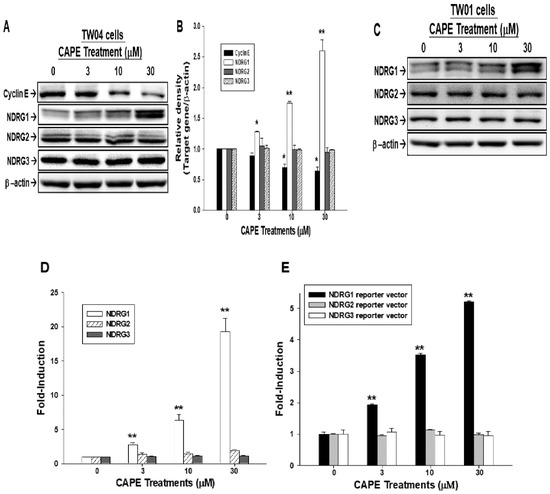 The result of the immunoblot assays illustrated that CAPE treatments significantly upregulated NDRG1 associated with the suppression of cyclin E protein levels in TW04 cells in a dose-dependent manner. 30 μM CAPE increased NDRG1 expression to 2.6-fold and decreased cyclin E expression to 0.7-fold (Figure 2A,B). However, CAPE treatments (3–30 μM) did not affect the expression of NDRG2 and NDRG3 (Figure 2A,B). A similar result was observed in TW01 cells, which showed only NDRG1 was stimulated by CAPE (Figure 2C). The RT-qPCR (Reverse transcription polymerase chain reaction) results showed that NDRG1 mRNA levels significantly increased after CAPE treatment in TW04 cells (Figure 2D). The promoter activity of NDRG1, but not NDRG2 and NDRG3, was also enhanced in TW04 cells treated with CAPE (Figure 2E). RT-qPCR and reporter assays showed the similar results with western blot.