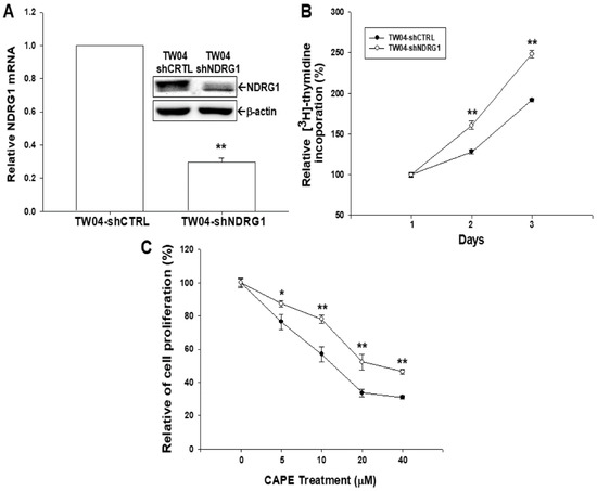 Knockdown of NDRG1 enhances cell growth in TW04 cell. (A) The expressions of NDRG1 in TW04-shCTRL and TW04-shNDRG1 cells were determined by immunoblot (top) and RT-qPCR (bottom) assays. (B) Proliferations of TW04-shCTRL (●) and TW04-shNDRG1 (○) cells were determined by the 3H-thymidine incorporation assay. The data were presented as the mean percentage of the TW04-shNDRG1 cells relative to the TW04-shCTRL cells (±SE, n = 6). The mean percentage (±SE) of cells in different days is compared to the day 1 (n = 6). (C) The TW04-shCTRL (●) and TW04-shNDRG1 (○) were treated with various concentrations of CAPE for 48 h, and growth inhibitory effect was determined by the CyQuant cell proliferation assay. The data were presented as the mean percentage (±SE) of cells relative to the solvent-treated control group (0 μM CAPE-treated, n = 8). (* p < 0.05, ** p < 0.01).