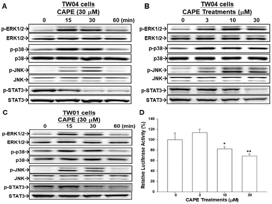 Results of the immunoblot assays showed that ERK, p38, and JNK were phosphorylated after 30 μM CAPE treatments in TW04 cells. The highest activation of JNK, ERK, and p38 was observed at 15 min after 30 μM CAPE treatment (Figure 5A). Interestingly, the immunoblot assays also showed a time-dependent inhibition of STAT3 phosphorylation after 30 μM CAPE treatment (Figure 5A). Further immunoblot assay illuminated a dose-dependent activation of ERK, p38, and JNK and inhibition of STAT3 phosphorylation in TW04 cells under the treatments of CAPE (3–30 μM) (Figure 5B). The similar finding was observed in TW01 cells as treated by 30 μM CAPE (Figure 5C). Results of reporter assays using the STAT3 specific reporter vector (pSTAT3-TA-Luc) containing the STAT3 binding site also indicated that CAPE downregulated STAT3 activity (Figure 5D).