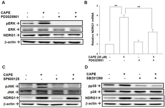 To explore whether the enhancement of CAPE-induced NDRG1 expression in NPC cells was through the activation of MAPK pathway, we pretreated cells with MAPK elements inhibitors, ERK (PD0325901), p38 (SB202190), and JNK (SP600125), for 1 h before exposure to CAPE treatments. The result of immunoblot assay showed that the phosphorylation of ERK was blocked when cells were pretreated with PD0325901 in TW01 cells. The level of CAPE-induced NDRG1 protein was also inhibited by the pretreatment of PD0325901 (Figure 6A). Results of RT-qPCR showed the similar results (Figure 6B). The pretreatment of SP600125 (Figure 6C) or SB202190 (Figure 6D) inhibited not only the phosphorylation of JNK or p38, respectively, but also the CAPE-induced NDRG1 protein levels.