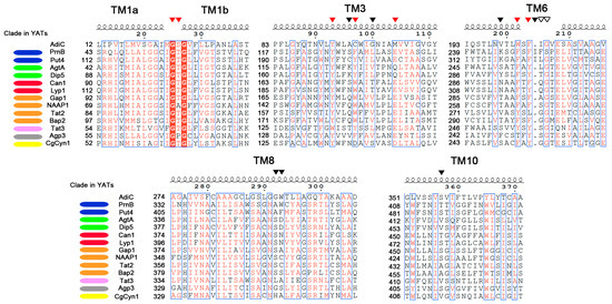 The important residues for substrate binding and determination of the specificity in the YAT family. A multiple alignment of the TMs1, 3, 6, 8 and 10 sequences from selected YAT members—for most of which structure-function studies have been performed. Residues in red font are highly conserved, while residues in red filled columns are absolutely conserved in the sequences of the selected YATs. Blue frames define residues that are conserved at least 70% of the sequences. Red triangles indicate the positions of residues that are highly conserved in YATs and are predicted to interact with the backbone of the amino acid substrates. Black triangles indicate specificity-determining residues that are poorly conserved in YATs and predicted to interact with the side chain of the amino acid substrates. Empty triangles indicate residues that indirectly affect the specificity of YATs. Color-coding next to the names of YATs shows which clade of the phylogenetic tree of Figure 2 the transporters belong to. The annotation of the alignment was done with ESPript 3.0 [45].