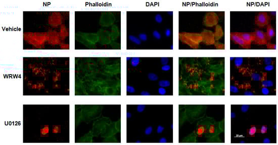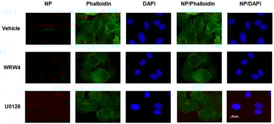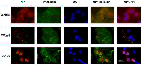 Localization of NP protein upon cell treatment with WRW4 and H1N1 infection A549 cells were infected with IAV A/PR/8/34 virus (MOI 10) in the presence of vehicle, WRW4 (10 μM) or U0126 (50 μM). Localization of the viral NP protein was assessed by immunofluorescence microscopy, using an anti-NP antibody, four hours post infection. The actin cytoskeleton (phalloidin) and nuclei (DAPI) were stained as well. The merged images are shown. Scale bar, 20 µM.
