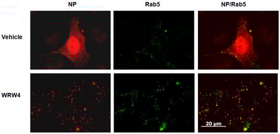 Colocalization of the NP protein with the Rab5 endosomal marker A549 cells were infected with IAV A/PR/8/34 virus (MOI 10) in the presence of vehicle, or WRW4 (10 μM). Four hours post infection, localization of the viral NP protein was assessed by immunofluorescence microscopy, using an anti-NP antibody. The early endosome was stained using Rab5 antibody. Note that the Rab5 staining showed some background that was removed using ImageJ. The merged images are shown. Scale bar, 20 µM.