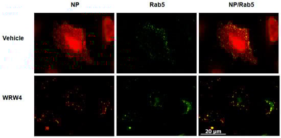 Colocalization of the NP protein with the Rab5 endosomal marker A549 cells were infected with IAV A/Udorn/72 virus (MOI 10) in the presence of vehicle or WRW4 (10 μM). Four hours post infection, localization of the viral NP protein was assessed by immunofluorescence microscopy, using an anti-NP antibody. The early endosome was stained using Rab5 antibody. Note that the Rab5 staining showed some background that was removed using ImageJ. The merged images are shown. Scale bar, 20 µM.