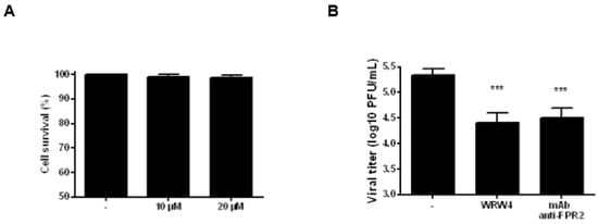 The potential offered by therapeutic-based antibodies has recently emerged []. Thus, we investigated the antiviral properties of the neutralizing anti-FPR2 mAb, FN-1D6-AI [,]. First, the cytotoxic effects of A549 cell treatment with 10 or 20 µM of the anti-FPR2 mAb was evaluated. Results showed no effect on cell cytotoxicity, by trypan blue staining (Figure 6A, 24 h post treatment). Then, A549 cells were pretreated with 10 µM of the anti-FPR2 mAb and infected with IAV A/PR/8/34 virus (MOI 1). 24 h post infection, infectious virus particles were evaluated in the supernatant by classical plaque assays. As shown in Figure 6B, A549 cells that were pretreated with the anti-FPR2 mAb released significantly fewer infectious viruses, compared with vehicle-treated infected cells. The effect of the specific anti-FPR2 antagonist, WRW4 (5 µM) was used as control. As expected, cell treatment with WRW4 significantly inhibited virus replication. Thus, these results showed that blocking FPR2 with the mAb, FN-1D6-AI significantly reduced viral replication in A549 cells.