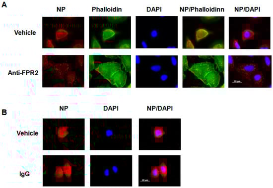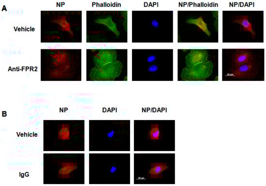 To confirm the results obtained with the FPR2 antagonist WRW4, and to investigate whether cell treatment with the anti-FPR2, FN-1D6-AI would also affect virus trafficking in the endosome, A549 cells were pretreated with 20 µg/mL of the anti-FPR2 mAb and then infected with IAV A/Udorn/72 (H3N2, MOI 10). Four hours post infection, immunofluorescence staining of the viral NP was assessed. Results showed that, in contrast to untreated cells, where NP was broadly expressed in the cytoplasm, upon cell treatment with the anti-FPR2 mAb, NP was specifically observed in punctuated endosomes (Figure 7A). Cell treatment with an IgG control antibody had no effect on NP localization, showing the specificity of the anti-FPR2 antibody (Figure 7B). Staining of the nucleus (DAPI) and actin (Phalloidin) were also included as controls. Similar results were observed, although at a lesser extent, upon IAV infection with A/PR/8/34 virus (Figure 8A,B). Notably, although comparable virus release was found by plaque assay between WRW4 and anti-FPR2 pre-treatment followed by IAV infection, the punctuated endosome vesicles in cells treated with the antibody were not as clear as in cells treated with WRW4. This discrepancy was most likely related to technical issues and possible loss of efficacy of the antibody. Indeed, the viral plaque assay was performed using an unfrozen antibody, while a frozen antibody was used for immunofluorescence staining. However, because a difference was still observed, these results showed that blocking FPR2 with the mAb FN-1D6-AI affects virus trafficking in endosomes and subsequent virus replication.