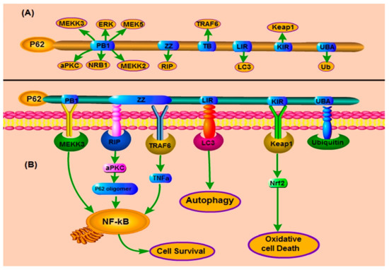 P62-interacting partners to activate different signaling pathways for cellular functions: (A) P62 has multiple domains, such as a PB1 domain, a ZZ-type zinc finger domain, a TRAF6-binding (TB) domain, an LC3-interacting region (LIR), KIR domain, and a ubiquitin-associated domain (UBA). PB1 domain plays an important role for self and hetero-oligomerization of p62 by binding with other PB1 containing protein, such as aPKC, ERK, and NBR1. P62 interacts with the RIP at ZZ zinc finger region, and TRAF6 at TB domain, which regulates NF-κB activation. P62 binds with LC3 by the LIR, and Keap1 by the KIR domain. The C-terminal UBA domain of p62 associates with ubiquitin; (B) P62 stimulates the oligomerization of aPKC and interaction with MEKK3 and caspase-8 leading to the enhancement of NF-κB activation. The LIR domain of p62 binds with LC3 to activate autophagy. Its KIR domain interacts through Keap1 to activate Nrf2 pathway that regulates oxidative stress.