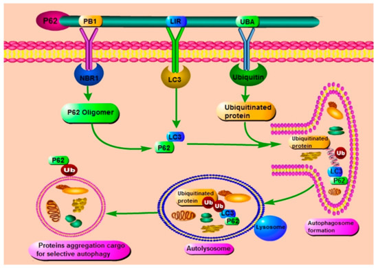 P62 and NBR1 are bound by their PB1 domain to induce p62 oligomerization that allows binding to LC3 to form p62-LC3 through LIR domain of p62. LIR domain of p62 induces autophagy by binding with LC3 and UBA domain binds with ubiquitinated protein by ubiquitin. These binding can regulate autophagosome formation, consequently which processes autolysosome by the presence of lysosome to regulate proteins aggregation cargo for selective autophagy.