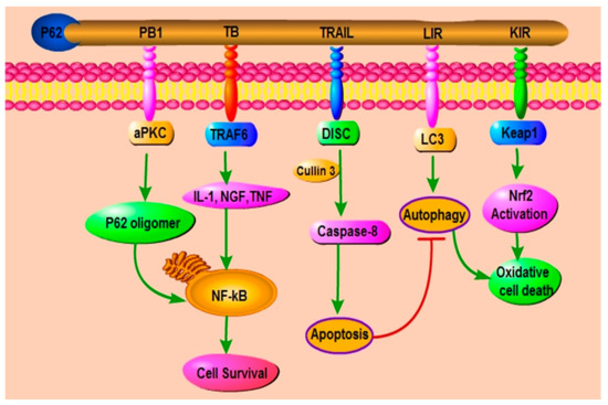 P62 mediate cell survival, cell death, and apoptosis: P62 stimulates the oligomerization of aPKC and TRAF6 binding TB domain leading to the enhancement of NF-κB activation to promote cell survival. P62 may activate caspase-8 by the presence of cullin3 which can induce apoptosis by autophagy inhibition. Caspase-8 activation and p62 oligomerization promote cell apoptosis.