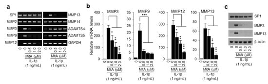 It is known that activation of catabolic signaling pathways in chondrocytes promotes cartilage degeneration [7,9,34]. To investigate whether MitA could regulate the expression of matrix degrading enzymes in OA chondrocytes, expression levels of MMPs and ADAMTSs were determined in mouse primary chondrocytes treated with IL-1β alone or with IL-1β and MitA. The result showed that MitA significantly abrogated mRNA inductions of MMP3, MMP9, MMP12, and MMP13 by IL-1β in a dose-dependent manner (Figure 1a). In contrast, mRNA expression level of MMP2 or MMP14 was not significantly changed by either IL-1β or MitA. Inductions of ADAMTS4 and ADAMTS5 mRNAs by IL-1β were not repressed in MitA-treated chondrocytes. qPCR analysis confirmed the suppression of MMP3, MMP9, MMP12, and MMP13 mRNAs by MitA (Figure 1b). Consistently, levels of secreted extracellular MMP3 and MMP13 proteins were markedly decreased in MitA-treated chondrocytes (Figure 1c). SP1 expression was not altered by MitA treatment (Figure 1a,c). These results indicate that MitA can potently inhibit IL-1β-induced catabolic gene expression.