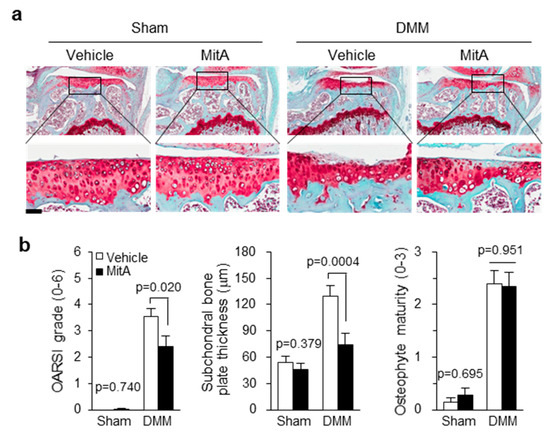 We next investigated whether MitA could inhibit traumatic OA progression in vivo. To induce traumatic OA, 10-week-old male mice were subjected to surgical destabilization of the medial meniscus (DMM). At 10 days after DMM operation, the first treatment of MitA was achieved by intra-articular (IA) injection. MitA was then injected at 10-day intervals. Cartilages collected 8 weeks after DMM surgery were stained with safranin-O to determine cartilage loss, subchondral bone plate thickness, and osteophyte formation. As shown in Figure 2a, in sham knee joints, cartilage integrities were comparable between vehicle- and MitA-treated groups. Importantly, MitA treatment alleviated DMM-induced cartilage erosion compared to vehicle-treated DMM cartilages based on safranin-O staining and OARSI scoring (Figure 2a,b). Supporting this result, MitA-treated DMM mice also showed less sclerosis than vehicle-treated DMM mice, suggesting that post-traumatic OA progression was indeed decelerated by MitA injection. In contrast, maturity of osteophyte was not changed by MitA treatment (Figure 2b). These results indicate that MitA can alleviate osteoarthritic cartilage lesions.