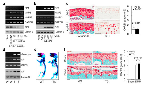SP1 is not required for MMP induction or OA. (a) Effects of SP1 knockdown using SP1 siRNA on MMP expression. mRNA and protein levels of indicated genes were determined by RT-PCR and Western blotting, respectively; (b) Overexpression of SP1 in chondrocytes does not induce expression of MMP3 or MMP13. mRNA levels in chondrocytes infected with adenoviral vector coding SP1 (Ad-SP1) with indicated MOI were determined by RT-PCR. Adenoviral vector lacking an insert (Ad-C) was used as a control (800 MOI); (c) Representative images of safranin-O staining, SP1 immunostaining, and OARSI scoring of cartilages from mice injected with Ad-C or Ad-SP1 (n = 5). Values are means ± SEM. Scale bar: 50 μM; (d–f) Effects of SP1 transgenic (TG) mice on OA; (d) Characterization of Col2a1-SP1 TG mice and wild type (WT) littermates; (e) Skeletal staining at embryonic day 18.5 (E18.5) of SP1 TG mice and their WT littermates; (f) Representative images of safranin-O staining and OARSI scoring of cartilages collected from WT and SP1 TG mice operated by DMM surgery (n ≥ 7). Values are means ± SEM. Scale bar: 50 μM.