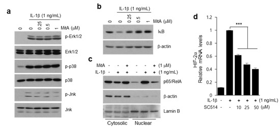 IL-1β-induced activation of NF-κB, but not MAP kinases, is inhibited by MitA in chondrocytes. (a–c) chondrocytes were pre-treated with MitA for 24 h and subsequently treated with IL-1β for 10 min. (a) MitA does not inhibit activation of MAP kinases. Activations of MAP3 kinases, Erk, p38, and Jnk were determined by Western blotting with phospho-antibodies; (b,c) MitA suppresses degradation of IκB and translocation of NF-κB; (b) Degradation of IκB was determined by Western blotting; (c) Nuclear translocation of p65/RelA was determined by subcellular fractionation and Western blotting. β-actin and Lamin B were used as markers of cytoplasmic and nuclear fractions, respectively; (d) Inhibition of HIF-2α expression by SC514, an IKKβ inhibitor, in IL-1β-treated chondrocytes (n = 4). Values are means ± SEM (*** p < 0.001).