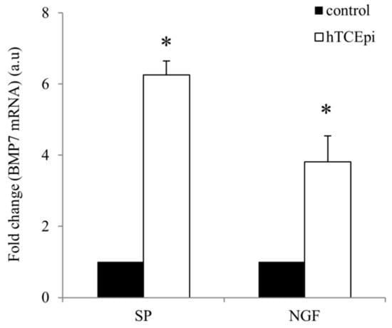 Relative expression levels of BMP7 mRNA in hTCEpi cells after treatment with SP (10−5 M) and NGF (100 ng/mL). Total RNA was isolated from SP and NGF treated hTCEpi cells after 24 h. Reverse transcription was performed using 1 µg of total RNA to prepare cDNA and qRT-PCR was performed to find differences in the expression levels of BMP7 mRNA. Relative expression pattern was analyzed by the comparative threshold cycle (2−ΔΔCt) method. Expression values were represented as fold change over the control on an arbitrary scale after normalization with GAPDH. Data represent mean ± standard deviation of three independent experiments. The p-values of <0.05 were considered statistically significant and are indicated by asterisks (*).