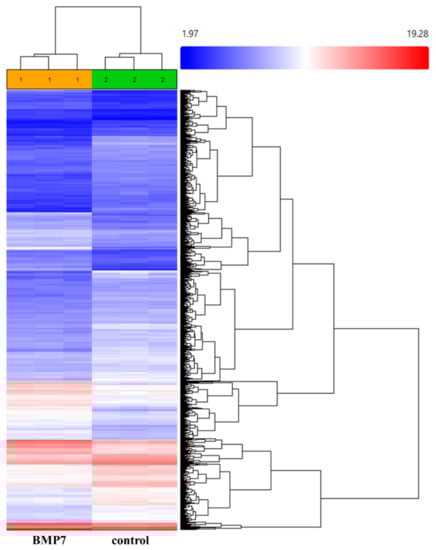 Hierarchal illustration of the differentially expressed genes in hTCEpi cells after treatment with BMP7 (100 ng/mL). Both twofold upregulated and downregulated genes were clustered. Untreated hTCEpi cells were served as control. After 24 h of treatment with BMP7, RNA was isolated and transcriptome-wide gene level expression profiling was performed using Clariom™ S arrays. Array scanning and data analysis were performed using Affymetrix® Expression Console™ software (v.1.4.1) that provides signal estimation and quality control functionality for the expression arrays, and the Affymetrix® Transcription Analysis Console (TAC) software (v.3.1), which performs statistical analysis and provides a list of differentially expressed genes. Expression level analysis was performed using the normalization method based on the processing algorithm called robust multi-array average (RMA) which was improved by Signal Space Transformation (SST-RMA, Affymetrix). Each array was performed in triplicates.