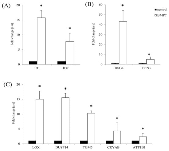 Validation of the Clariom™ S array identified differentially expressed transcripts. hTCEpi cells were cultured in the presence of 100 ng/mL BMP7 and RNA was isolated after 24 h. Reverse transcription was performed using 1 µg of total RNA to prepare cDNA and qRT-PCR was performed to find differentially expressed transcripts using respective primers. (A) ID proteins (ID1 and ID2); (B) cytoskeletal proteins (DSG4 and EPN3); and (C) metabolic enzymes (LOX, DUSP14, TGM5, CRYAB, and ATP1B1) differential expression was analyzed using respective primers. Relative expression pattern was analyzed by the comparative threshold cycle (2−ΔΔCt) method. Expression values were represented as fold change over the control on an arbitrary scale after normalization with GAPDH. Data represent mean ± standard deviation of three independent experiments. p-values of <0.05 were considered statistically significant and are indicated by asterisks (*).