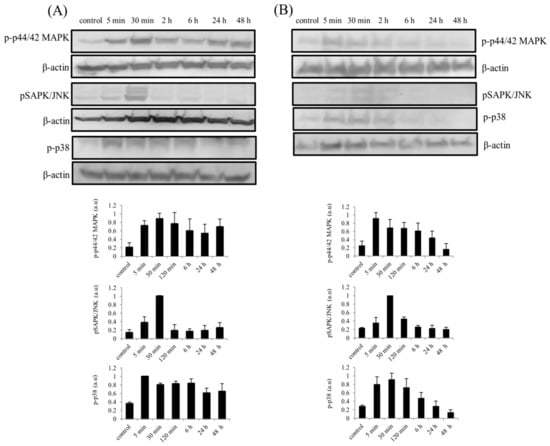 Activation of MAPK cascade proteins in (A) hTCEpi cells and (B) SFs after treatment with BMP7 (100 ng/mL) at different time points. Cells were treated with BMP7 and the total cell lysates were collected at time points 5 min, 30 min, 2, 6, 24 and 48 h after stimulation, and subjected to immunoblot analysis. Sustained activation of p44/42 MAPK and p38 until 48 h in hTCEpi cells and until 6 h in SFs was observed, whereas, in both cell types, only transient activation of pSAPK/JNK was observed. Amounts of the β-actin protein levels which were detected with an anti-β-actin antibody served as a loading control. Differences in the phosphorylation levels (p44/42 MAPK, SAPK/JNK and p38) were quantified using ImageJ software and the values were normalized to the corresponding β-actin signal. Data represent mean ± standard deviation of the phosphorylation levels shown as arbitrary units from more than three independent experiments. One representative immunoblot of at least three independent experiments is shown.