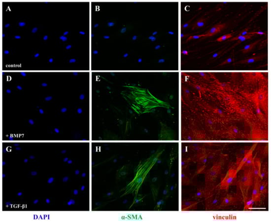Immunofluorescence detection of the expression of α-SMA in primary human SFs after treatment with BMP7. Serum-starved SFs were cultured in the presence of BMP7 (100 ng/mL) and TGF-β1 (10 ng/mL) for 72 h and their activation was analyzed by staining with an anti-α-SMA (green) and vinculin (red) antibodies. An increase in the expression of focal adhesions was observed with vinculin antibody staining and the transformation of fibroblasts into activated myofibroblats was observed with α-SMA antibody staining. (B) (control), (E) (+BMP7) and (H) (+TGF-β1) represent α-SMA staining (green) and (C) (control), (F) (+BMP7) and (I) (+TGF-β1) represent vinculin (red) immune staining. (A,D,G) represent nuclei counter stained with 4,6-diamidino-2-phenylindole (DAPI) (blue). Scale bar: 50 μm.