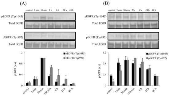 Stimulation of hTCEpi cells and SFs with BMP7 also resulted to the activation of EGFR along with MAPK signaling pathway. Elevated phosphorylation of EGFR at Tyr1045 and at Tyr992 was observed immediately after BMP7 stimulation (Figure 9). In epithelial cells, phosphorylation of EGFR at Tyr1045 and Tyr992 reached its maximum by 30 min and decreased gradually to its normal endogenous levels after 24 h of stimulation (Figure 9A). In SFs, we observed sustained activation of EGFR at Tyr992 until 48 h of stimulation whereas EGFR at Tyr1045 reached its endogenous levels by 48 h of stimulation with BMP7 (Figure 9B). No differences were observed in the total EGFR protein levels during the course of BMP7 stimulation. Similarly, compared to the BMP7 stimulation alone, no difference in the phosphorylation of EGFR observed when the epithelial cells were stimulated with BMP7 in the presence of its antagonist noggin (Figure S3B).
