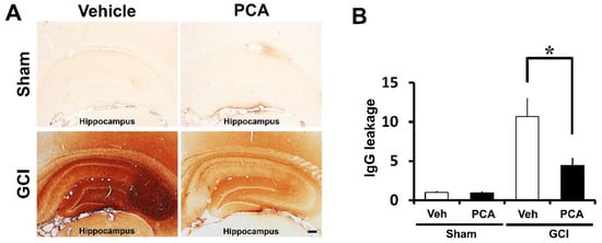2.3. PCA Prevents Ischemia-Induced Blood–Brain Barrier (BBB) Disruption