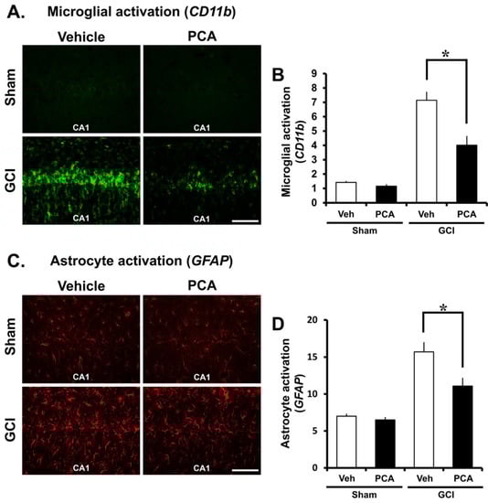 2.4. PCA Decreases Ischemia-Induced Inflammatory Responses Mediated by Microglia and Astrocytes