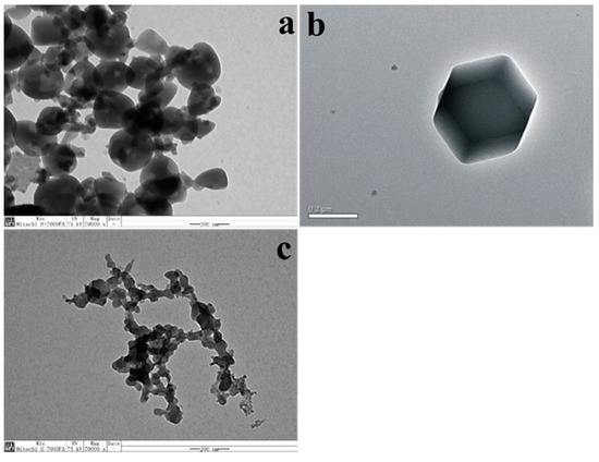 TEM images: (a) hierarchical ZIF-8; (b) hexahedral ZIF-8; (c) BCL-ZIF-8.