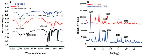 (a) Fourier transform infrared (FT-IR) spectra of samples of hierarchical ZIF-8; BCL and BCL-ZIF-8; (b) powder X-ray diffraction (PXRD) patterns of samples of hierarchical ZIF-8 and BCL-ZIF-8.