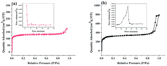 Nitrogen gas adsorption/desorption isotherms and pore size distributions for (a) hexahedral ZIF-8 and (b) hierarchical ZIF-8.
