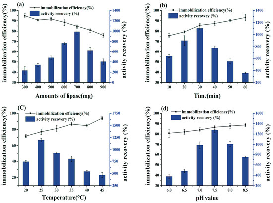 As is common, immobilization efficiency and activity recovery were affected by immobilization conditions. This included lipase loading, adsorption time, pH value, and immobilization temperature, which were all studied in this work.