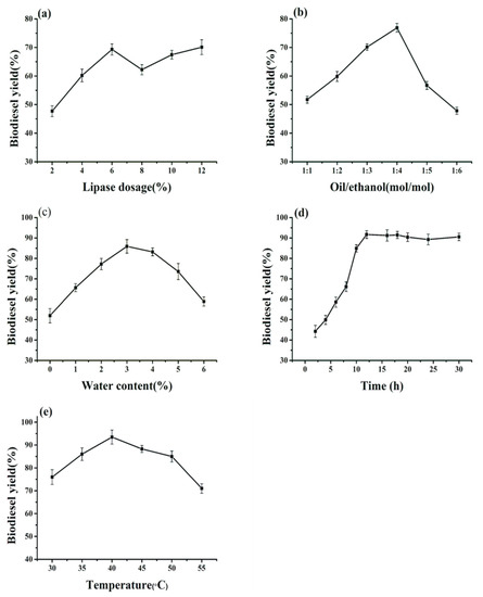 Water is regarded as one of the main factors in a mixture of transesterification reaction, because it has the ability to maintain the original conformation of the enzyme and achieve equilibrium in the reaction system for further enhance activity [39,40]. As recorded in Figure 7c, this yield was raised to 85.9% by placed of 3% water to the reaction mixture. Beyond 3%, the biodiesel yield decreased continuously. Though water is important in the reaction, the increased moisture in the system has a negative effect, making the lipase more flexible, resulting in unwanted reactions such as hydrolysis [41]. For example, the maximum biodiesel production for commercial Novozym 435 lipase was obtained without excess of moisture content in a transesterification reaction [42]. The best water content depends on the feedstock oil, lipase type, and immobilized support [43].