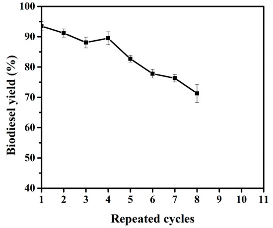 The transesterification reaction is an endothermic reaction, which implies that when the temperature increases, the final output rises. However, enzymes show the best activity at a suitable temperature according to the kind of enzyme and the immobilization technique used. Continually raising the temperature leads to protein denaturation, thus reducing biodiesel synthesis [46]. As noted in Figure 7e, the conversion yield increases with increasing temperature from 25 to 40 °C to the greatest yield of 93.4% at 40 °C. Above 40 °C, the conversion yield gradually diminishes. As stated, the ideal temperature for enzymatic transesterification comes from the interplay between the operational stability of the biocatalyst and the transesterification rate [43]. You et al. [47] obtained a maximal yield of biodiesel at 35 °C when they employed immobilized BCL on modified attapulgite. Li et al. [24] obtained the highest conversion of biodiesel at 45 °C when they used immobilized BCL on heterofunctional magnetic nanoparticles. Thus, the best conditions for transesterification reaction are as follows: BCL-ZIF-8 6 wt %, molar ratio of oil to ethanol 1:4, water content 3%, transesterification time 12 h with three-step addition of alcohol at 4 h intervals, reaction temperature 40 °C, and agitating speed 200 rpm.