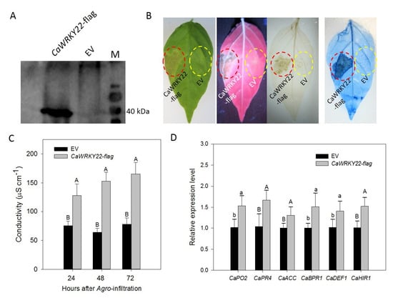 2.5. Transient Overexpression of CaWRKY22-Triggered HR-Like Cell Death and Accumulation of H2O2 in the Leaves of Pepper Plants