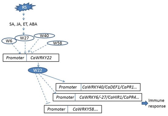 Hussain, A.; Li, X.; Weng, Y.; Liu, Z.; Ashraf, M.F.; Noman, A.; Yang, S.; Ifnan, M.; Qiu, S.; Yang, Y.; et al. CaWRKY22 Acts as a Positive Regulator in Pepper Response to Ralstonia Solanacearum by Constituting Networks with CaWRKY6, CaWRKY27, CaWRKY40, and CaWRKY58. Int. J. Mol. Sci. 2018, 19, 1426. https://doi.org/10.3390/ijms19051426