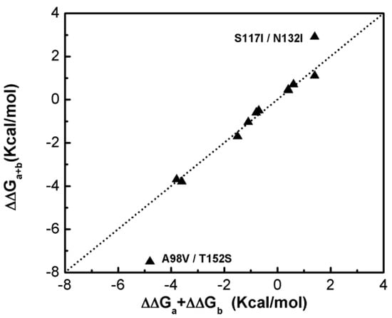 One the other hand, some mutations that involve direct physical interactions did exhibit strong non-additivity. For example, the double-site mutant A98V/T152S showed strong non-additivity compared with the corresponding single mutations, and melting temperature change caused by the double-site mutation was 7.6 °C less than the summation of those imposed by the two corresponding single mutations [,]. In the native structure, the two residues A98 and T152 orient to one another and form direct contact. Matthews and colleagues [] suggested that the dynamic perturbation a mutation introduces will start at the mutation site and spread to its neighboring sites. According to their observation, for a given site, if its neighborhood can digest more perturbations caused by mutation at this site, then such a mutation might impose smaller changes to protein thermal stability. In the case of A98V/T152S, the two sites have strong interactions and thus their neighborhood’s responses to the mutations at these sites heavily depend on the detailed interactions: presumably mutations that enhance the two-site contacts might weaken the power of the neighboring structures to relieve the mutation perturbations, thus causing larger thermal stability changes. Interestingly, other mutations that do not involve direct interactions were also found having strong non-additivity [].