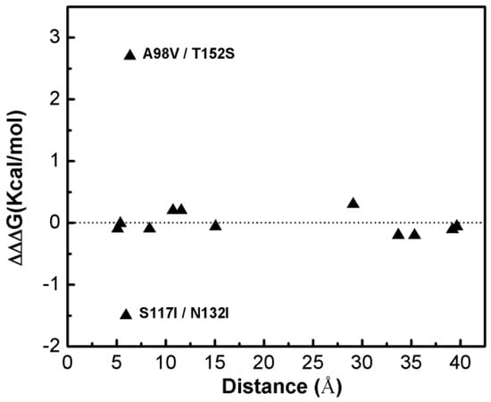 Figure 1 shows that most of the double-site mutations are strong additive, and the two double-site mutations, the S117I/N132I and A98V/T152S, show significant non-additivity. Interestingly, compared with its component single mutations the non-additive effect of the double-site mutant A98V/T152S significantly decreases the enzyme thermo-stability due to increment in free energy change, whereas the non-additive effect in S117I/N132I makes the enzyme stable due to a decrement in free energy change. Quantitatively, the non-additive effect of mutant S117I/N132I is weaker than that of A98V/T152S. There is no obvious correlation between site distance and the additivity effect of double-site mutation (Figure 2). We noticed that the distances between the sites of double-site mutations with strong non-additivity are relatively small and the reverse scenario is not necessarily true, i.e., double-site mutations exhibit very weak non-additivity whose mutation-site-distance are actually very short. No strong non-additivity effect was observed for long-distance double-site mutants. Presumably, intensive interference between the two sites of a double-site mutation might be required in order to exhibit a strong non-additivity effect, and this interferential interaction might be lacking or very weak when the two sites are well-separated. However, for a relatively short double-site mutation, it is still interesting to understand why a few of them, such as E128A/V131A, are non-additive while a majority of them are still additive.