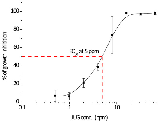 The growth-inhibiting activity of juglone was examined against planktonic growth of the model species Cobetia marina (ATCC 25374). C. marina has previously been used as model species for marine biofilm related studies [7,13,15,26,27]. It was found to have strong inhibition against C. marina at 16 ppm, while the EC50 was found to be at 5 ppm, Figure 1. This is in good agreement with previous work where bacterial attachment for the same species was assessed [15]. The minimum bactericidal concentration (MBC) for C. marina was found to be at 16 ppm. The measured concentration of released juglone, as shown in the previous section, falls within the same range as the concentration for the EC50 for this species.