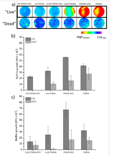 The in situ evaluation of biofilm growth on coated surfaces was achieved through the use of a plate reader utilising nucleic acid staining. In Figure 2, the effect of each coating, i.e., 2 NP, 2 biocidal, and 2 controls, on biofilm attachment and growth is shown (detailed coating formulations can be seen in Materials and Methods, Overall, from the plate reader coating scans (live cells stained with Syto9) (Figure 2a), a clear difference in biofilm growth is apparent for juglone- and Cu2O-containing coatings when compared to their controls, PMMA and PMMA + Rosin which acquired significantly higher growth (p < 0.004). For the “dead” (propidium iodide stained cells) wavelength measurements (“dead” = cells with compromised membranes), there was no significant difference between coatings and there was an overall low number of compromised cells for the duration of the experiment.
