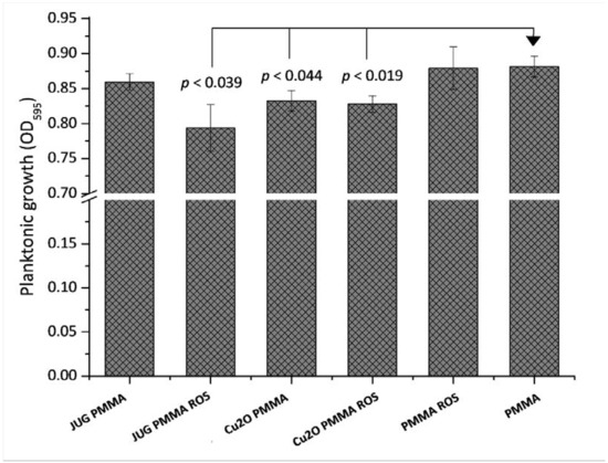 The planktonic growth measured at the 48 h end-point within the wells containing the coated coupons can be seen in Figure 3. Interestingly, differences were also found in planktonic growth within the wells containing the different coatings. Planktonic growth was found to be significantly lower in the wells where coatings contained juglone (p = 0.039) and Cu2O (p = 0.044 and p = 0.019) when compared to the controls (PMMA ROS and PMMA), with the exception of the Juglone–PMMA combination. As shown earlier, the rosin additive performed better in releasing juglone into the solution, therefore its higher availability could account for lower bacterial growth in these wells.