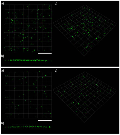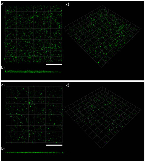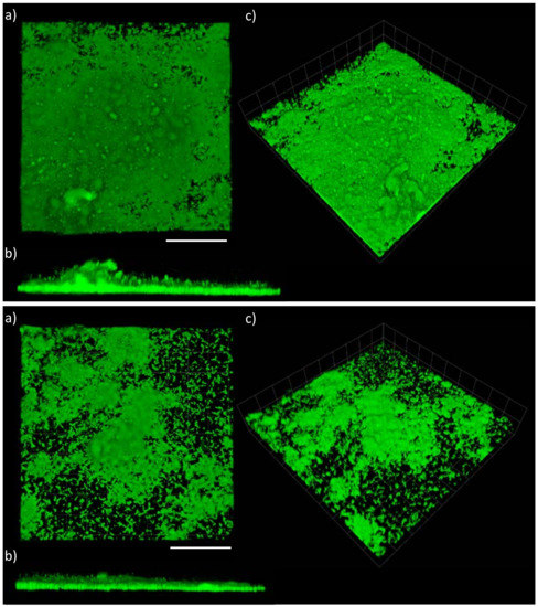 CLSM microscopy on LIVE/DEAD stained C. marina on the coated surfaced at the end-point (48 h), where (Top): JUG + PMMA + ROS, (Bottom): JUG + PMMA and (a) top view, (b) side view and (c) 3D view. Scale bars = 112 μm. JUG = juglone, PMMA = poly(methyl methacrylate), ROS = rosin.