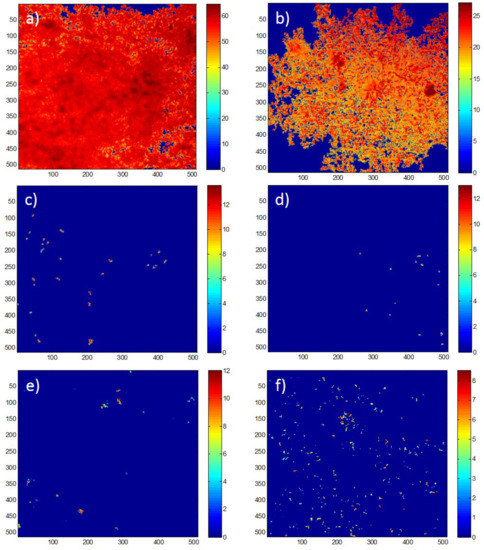 Representative COMSTAT (MATLAB) intensity map reflecting biofilm thickness (scale in μm) on (a) PMMA + ROS, (b) PMMA, (c) PMMA+ ROS + JUG, (d) PMMA + JUG, (e) PMMA + ROS + Cu2O, f) PMMA + Cu2O. JUG = juglone, PMMA = poly(methyl methacrylate), ROS = rosin.