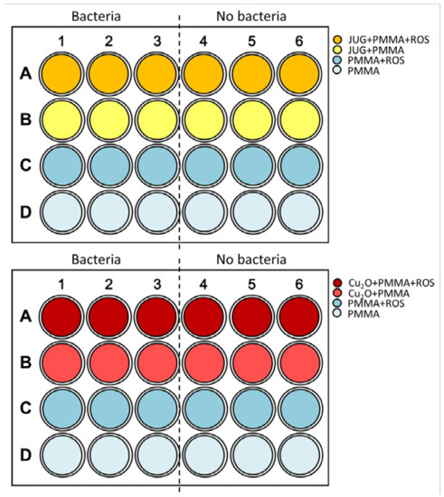 Coupon experimental set-up with coatings (right labels) containing: JUG (top) and Cu2O (bottom). Half of the plates indicate “Bacteria” = wells where bacteria will be inoculated and “No bacteria” wells where no bacteria were added, serving as blanks. JUG = juglone, ROS = rosin, PMMA = poly(methyl methacrylate).